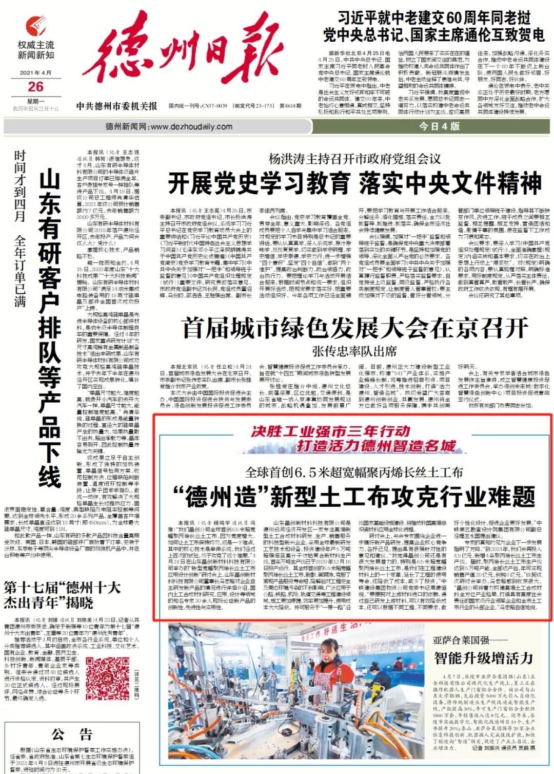 山東晶創新材料科技有限公司是德州運河經濟開發區一家專注高端新型土工合成材料研發、生產、銷售服務的科技型新興企業,采用全球最新研發工藝技術和設備,投資建設年產5萬噸超強細旦高分子紡粘復合新材料生產線,首條萬噸生產線已于2020年12月16日投產運行。其全球首創的6.5米超寬幅聚丙烯長絲土工布,耐酸、堿腐蝕,克服了常規產品服役壽命短、降解后對工程安全及周邊環境污染的不利影響,廣泛應用于公路、鐵路、機場、軌道交通等工程建設領域,施工更加便捷,效率更加提升,使用成本大大降低。并可服務于“一帶一路”沿線國家基礎設施建設,將推動我國高端非織造材料應用全球化進程。
