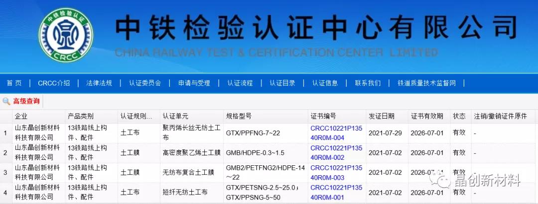 2021年7月14日、8月6日,在中國檢驗認證中心有限公司(CRCC)所發布的2021年(總第514號)和第31號(總第518號)認證公告:山東晶創新材料科技有限公司所生產的土工膜和土工布連續獲得4份CRCC認證證書。分別是土工膜類:高密度聚乙烯土工膜(證書編號:CRCC10221P13540R0M-002),無紡布復合土工膜(證書編號:CRCC10221P13540R0M-003);土工布類:短纖無紡土工布(證書編號:CRCC10221P13540R0M-001),聚丙烯長絲無紡土工布(證書編號:CRCC10221P13540R0M-004)。