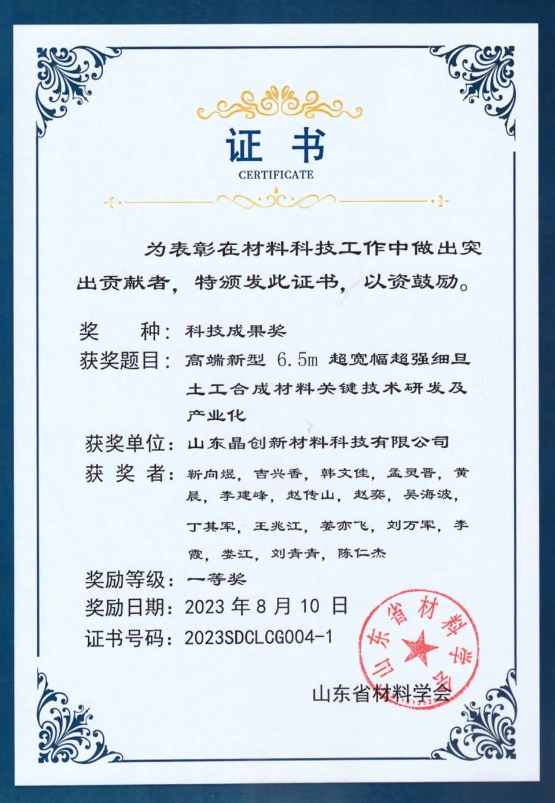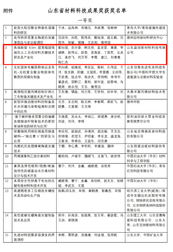 山東省材料學會成立專家委員會,評出科技成果獎一二三等獎共 35 項,山東晶創(chuàng)新材料科技有限公司申報此次評選,榮獲“山東省材料科技成果獎-一等獎”